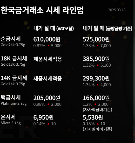 최근 순금 1돈의 가격은 어떻게 변동하고 있을까요? 2025년 3월 18일 기준으로 순금이 525,000원에 매입되고, 610,000원에 판매되고 있다는 정보가 있어요.